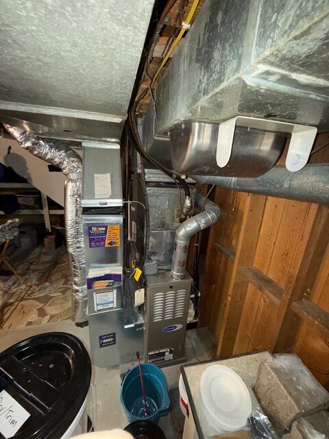 Branch box placement, electrical upgrades, condensate management, humidifier reconnection, and line-set routing were completed for a clean finished system.