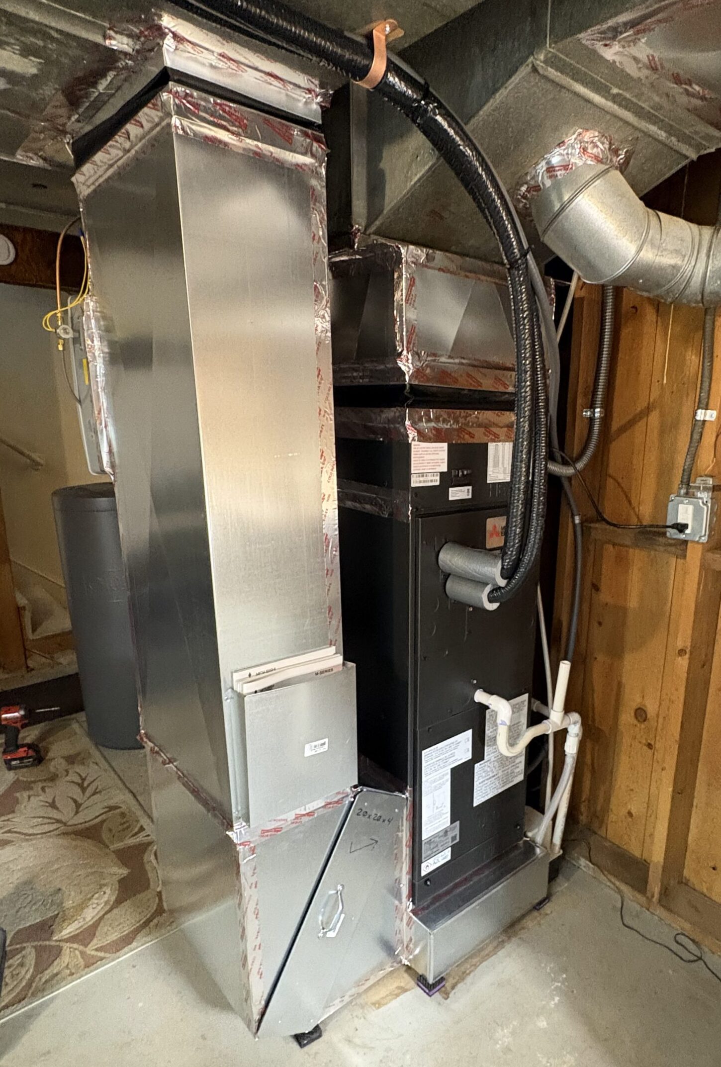 The existing furnace was replaced with a Mitsubishi SVZ air handler mounted on a raised return base with upgraded return and filtration details.